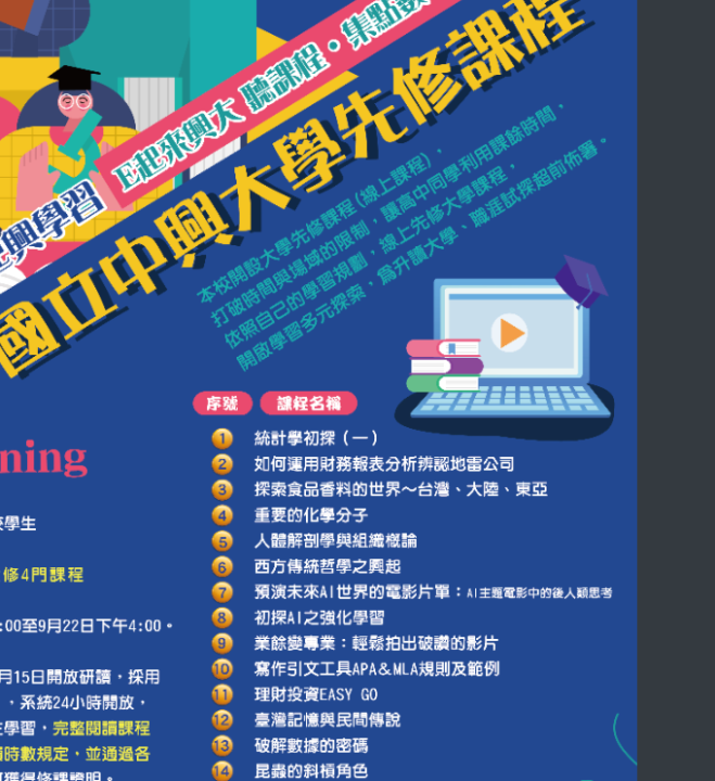 國立中興大學開設大學先修課,提供免費線上學習課程,114年9月8日起開始報名