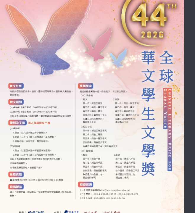 一、「第44屆全球華文學生文學獎」徵文對象為海內外目前就讀高中職、國中或同等學力,並以華文書寫者,均可參加。