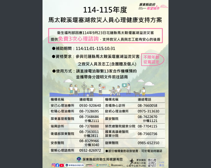 主旨:函轉屏東縣政府衛生局轉知衛生福利部「114-115年度馬太鞍溪堰塞湖救災人員心理健康支持方案」,請轉知所屬救災人員及志工踴躍參與服務方案,如說明,請查照。