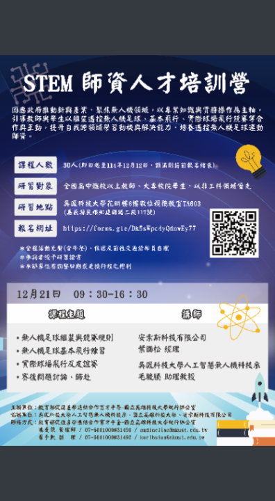一、本課程聚焦無人機領域,以專業知識與實務操作為主軸,引導教師與學生以組裝遙控無人機足球、基本飛行、實際球場競賽等合作與互動,提升自我跨領域學習動機與解決能力,培養相關人才。