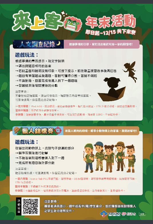 客家委員會訂於114年11月18日至114年12月15日期間,於旨揭學習入口網站舉辦2場「全國線上競賽活動」,凡參與競賽之學生就有機會獲得iPad 11及Acer平板電腦等多達35項精美獎品,