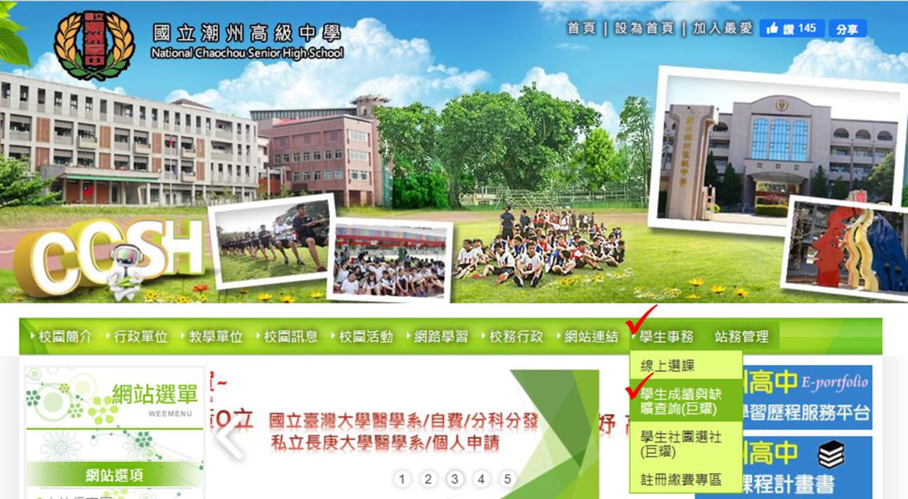 1.在校生:請至學校網站-學生事務-學生成績與缺曠查詢(巨耀),線上成績/選課系統https://www.ccsh.ptc.edu.tw/index.php?tpl=1線上申請。(說明圖檔如附件)