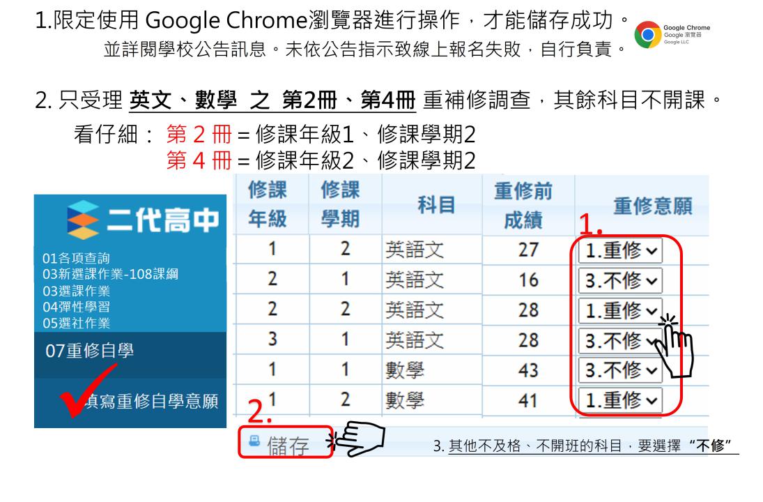 2.除英文、數學第二、四冊的科目請選擇「不修」。