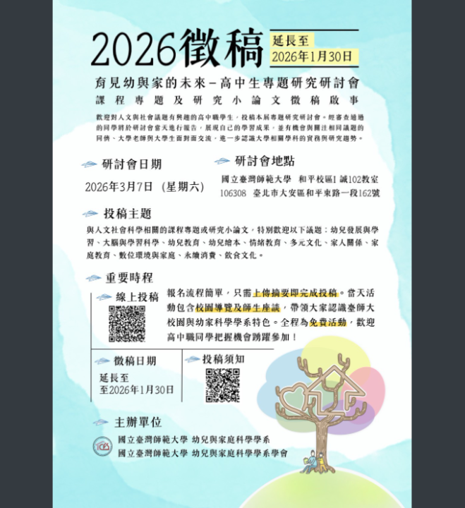 三、研討會資訊:(一)主辦單位:本校幼兒與家庭科學學系、幼兒與家庭科學學系學會。(二)時間:115年3月7日(星期六)。(三)地點:本校和平校區I 誠102教室。(四)報名費:免費。(五)投稿方式:即日起至115年1月30日(星期五),至本研討會線上投稿系統,上傳專題摘要或小論文摘要,即完成投稿。(六)相關連結:投稿須知 https://reurl.cc/NNNNvQ 。線上投稿系統 https://forms.gle/ek9RiRrw39DqLBcv9。