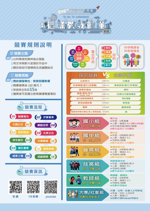 二、旨揭競賽由本署、行政院國家科學委員會指導,並由國立高雄師範大學、國研院國網中心、國立自然科學博物館、國立臺灣科學教育館、國立科學工藝博物館、國立海洋生物博物館、國立海洋科技博物館、內政部國家公園署海洋國家公園管理處共同辦理,邀請對科學有興趣之師生,透過科學問題發想、資料收集與理解、探究及表達,以科學的角度解答來解決生活議題,培養科學敘事能力。