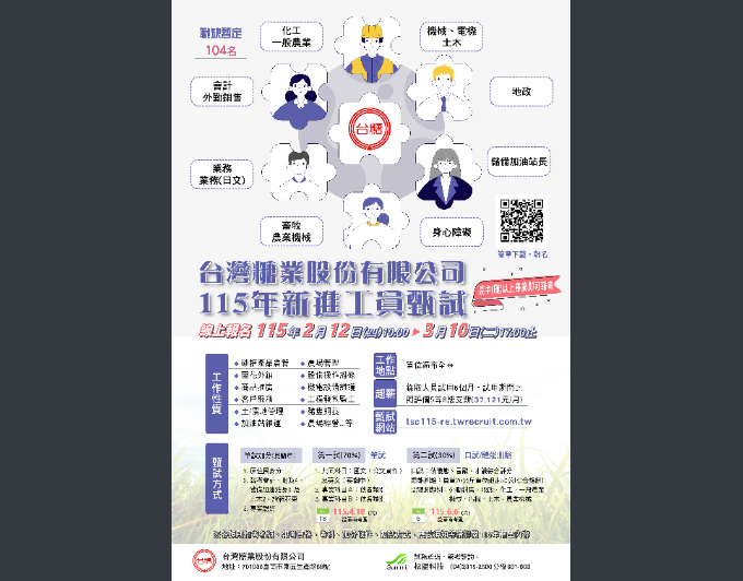 主旨:檢送「台灣糖業股份有限公司115年新進工員甄試」簡章暨甄試招考訊息,為促就業,惠請協助公告周知,請查照。